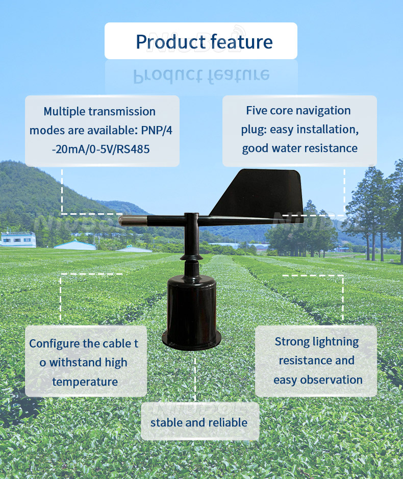 3、电阻式风向传感器:这种风向传感器采用类似于滑动变阻器的结构。产生的阻力的最大值和最小值分别标记为360°和0°。当风向标旋转时,滑动变阻器的滑杆会随着顶部的风向标旋转,产生的不同电压变化可以计算出风向的角度或方向。