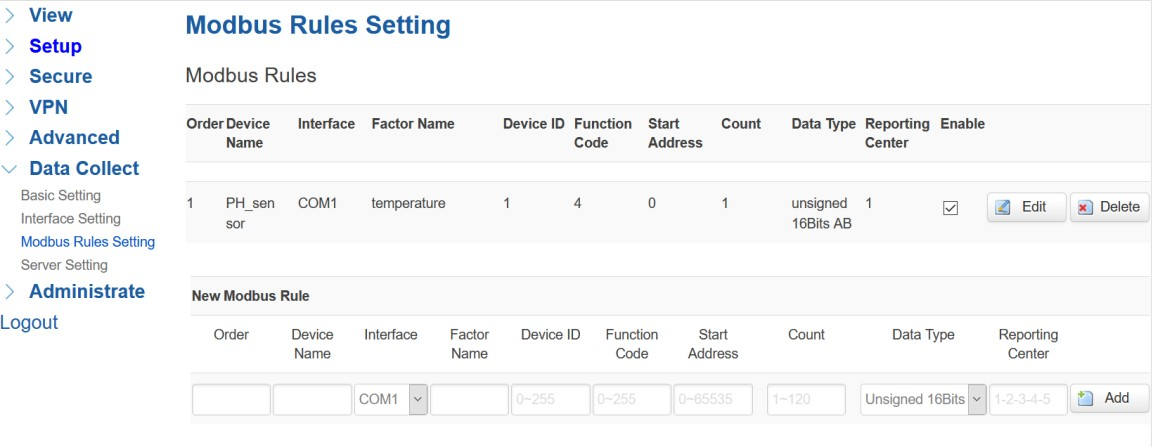 Modbus 规则设置是针对工业路由器作为 Modbus 主设备基于 Modbus 协议从从设备获取数据。您可以在其上配置无限的 Modbus 规则。工业路由器提供可定义的因子名称、设备 ID、功能代码、寄存器地址和计数寄存器数量的选项,请按照从设备数据表获取这些信息。